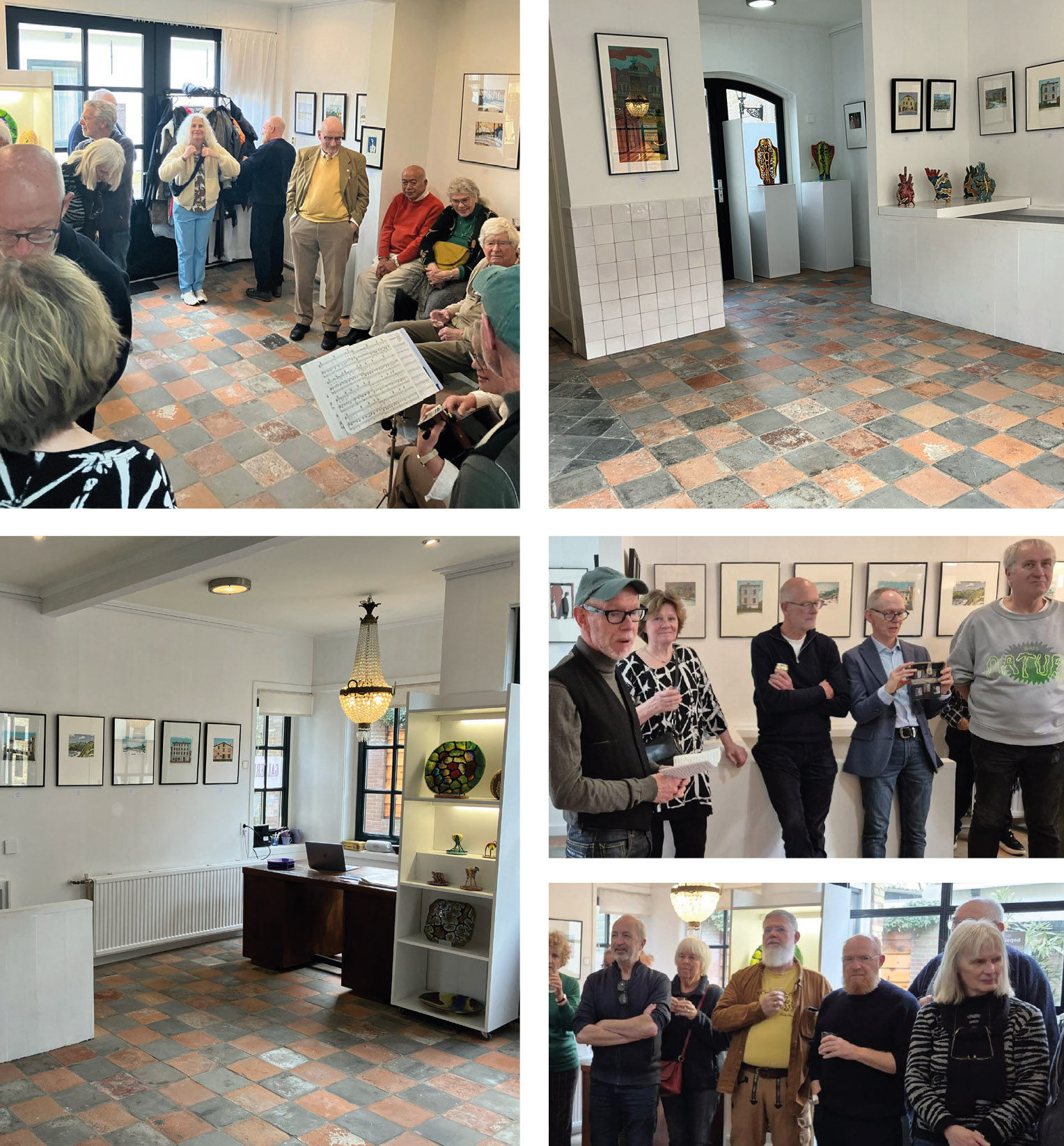 Collage van opening en inrichting bij expositie Plaatsbepalingen